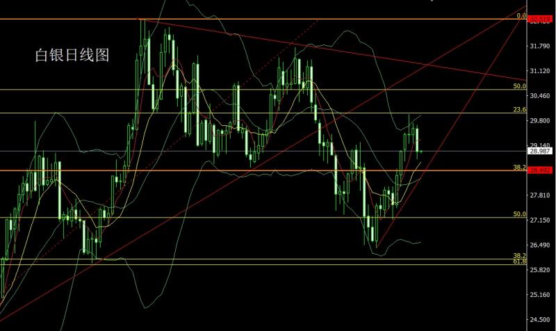 白银市场昨日开盘在29.589的位置后行情先回落给出29.318的位置后行情拉升,日线最高触及到了29.682的位置后行情强势回落,日线最低给到了28.764的位置后行情整理,日线最终收线在了28.964的位置后行情以一根下影线很长的大阴线收线,而这样的形态收尾后,今日的行情29.4空止损29.6,下方目标看28.8和28.6,跌破看28.4-28.3支撑点。
