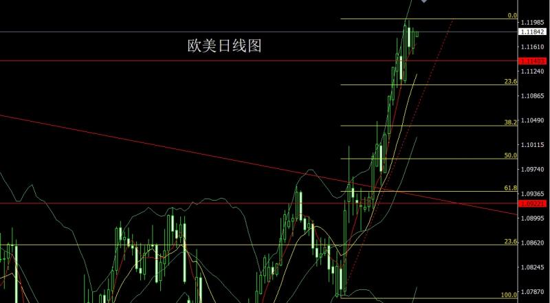 欧美市场昨日开盘在1.11591的位置后行情先拉升给出1.11790的位置后行情回落,日线最低给到了1.11491的位置后行情二次拉升,日线最高触及到了1.11906的位置后行情整理,日线最终收线在了1.11842的位置后行情以一根下影线稍长于上影线的大阳线收线,而这样的形态收尾后今日的行情1.11600多止损1.11400,目标看1.11850和1.12000和1.12300.