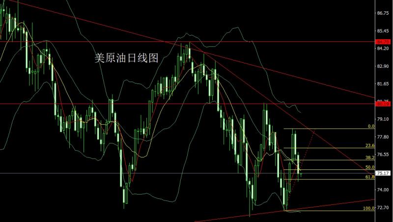昨日美原油市场早盘开盘在76.48的位置后行情先拉升给出76.7的位置后行情快速回落,日线最低给到了74.55的位置后行情整理,日线最终收线在了75.14的位置后行情以一根下影线很长的大阴线收线,而这样的形态收尾后,今日的行情75.9空止损76.5,下方目标看74.9和74.5和74.
