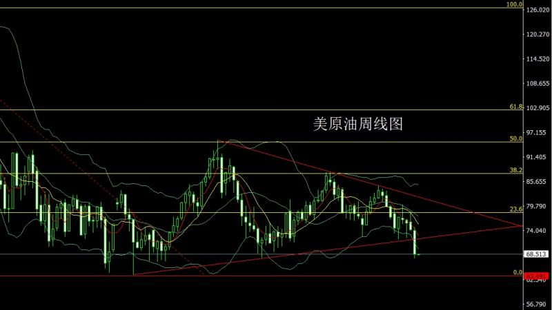 美原油市场昨日开盘在74.05的位置后行情小幅拉升给出74.97的位置后行情一路震荡回落,盘中破位本轮周期三角整理下轨后加速下行,周线最低给到了67.52的位置后行情整理,周线最终收线在了68.52的位置后行情以一根上下影线等长的大阴线收线,而这样的形态问后,本周回踩空,点位上,上周71.1的空减仓后止损跟进在71,今日的行情69.5空止损70.5,下方目标看68和67.5,跌破看67和66.5-66.