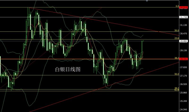 昨日白银市场早盘开盘在28.672的位置后行情先回落,日线最低给到了28.514的位置后行情震荡拉升,破位前期高点后日线最高触及到了29.919的位置后行情整理,日线最终收线在了29.866的位置后行情以一根下影线较长的的大阳线收线,而这样的形态收尾后,今日回踩多,点位上,本周28.05和前日28.1的多减仓后止损跟进在28.7持有,今日的行情29.5多止损29.3,目标看30和30.3和30.5.