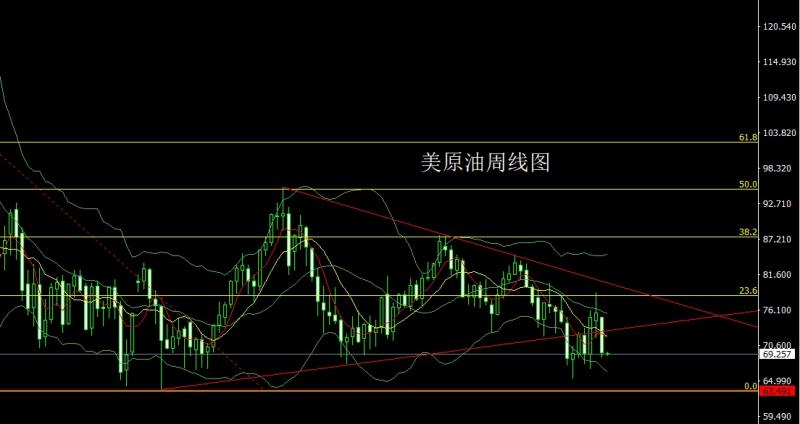 美原油市场上周低开在74.97的位置后行情小幅拉升给出75.01的周线高点后行情强势回落,周线最低给到了68.72的位置后行情整理,周线最终收线在了69.37的位置后,周线以一根下影线稍长的饱和大阴线收线,而这样的形态收尾后,本周市场先空后多,点位上,今日70.3空止损70.8,下方目标看69.3和68.7,跌破看68.2和67.5.