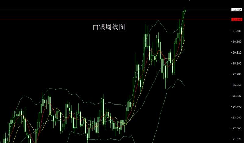 白银市场上周开盘在31.296的位置后行情先回落,周线最低给到了30.692的位置后行情强势拉升,到周五周线破位前期高点后最高触及到了33.75的位置后行情整理,周线最终收线在了33.715的位置后,周线以一根下影线很长的大阳线收线,而这样的大阳线收线后,本周行情延续多,点位上,上周30.8的多和30.9的多减仓后止损跟进在31.5持有,今日的行情早盘先回落给出33.2多止损32.9,目标看33.8和34和34.5-35.