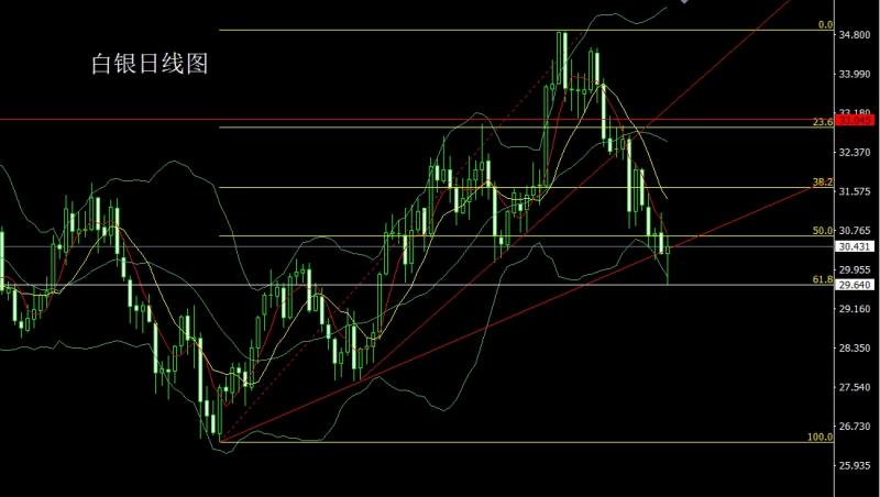 白银市场昨日开盘在30.296的位置后行情小幅拉升给出30.424的位置后行情震旦回落,日线最低给到了29.65的位置后行情受到本轮上行斐波那契的的61.8支撑强势拉升,日线最高触及到了30.652的位置后行情受到技术压力整理,日线最终收线在了30.424的位置后行情以一根下影线极长的锤头形态收线,而这样的形态收尾后,今日的行情回踩多,点位上,今日30.1多止损29.9.目标看30.65,破位看31和31.3.