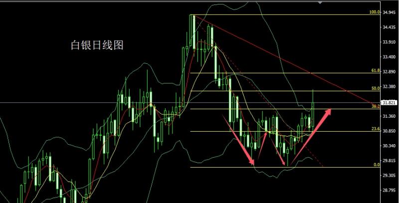 白银市场昨日小幅高开在31的位置后行情先回落给出30.84的位置后行情强势拉升,日线最高触及到了32.269的位置后行情受到本轮回落斐波那契的50压力整理,日线最终收线在了31.821的位置后,日线以一根上影线很长的大阳线收线,而这样的形态收尾后,日线有效上破日线双底颈线关口今日的行情回踩延续多,点位上,今日的行情31.5多止损31.25,目标看31.9和32.27如果上破上方看32.45和32.6压力。