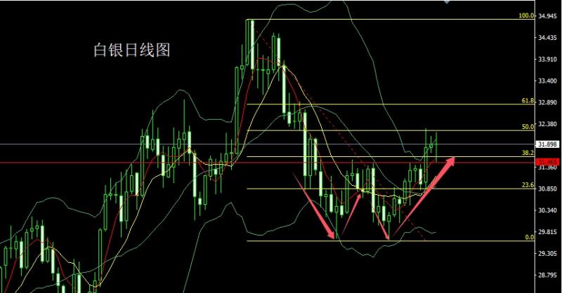 白银市场昨日开盘在31.901的位置后行情先拉升给出32.097的位置后行情快速回落,日线最低给到了31.455的位置后行情强势拉升,日线最高触及到了32.177的位置后行情整理,日线最终收线在了31.898的位置后行情以一根下影线长于上影线的启明星形态收线,而这样的形态收尾后,今日的行情延续多,点位上,昨日31.55多减仓后止损跟进在31.4持有,今日31.6多止损31.4,目标看32.2和32.5和32.7.