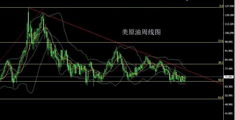 上周美原油市场周初开盘在67.21的位置后行情小幅回踩给出67.08的位置后行情强势震荡拉升,周线最高触及到了71.41的位置后行情受到周线级别不林中轨压力整理,周线最收线在了71.07的位置后,周线以一根上影线稍长的大阳线收线,而这样的形态收尾后,周线有区间反弹的需求,点位上,今日70.5多止损70.目标看71.4和72和73-73.5.