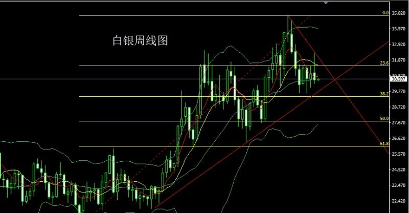 白银市场上周小幅高开在31的位置后行情先拉升周线最高触及到了本轮下行趋势线压力32.344的位置后行情尾盘强势回落,周线最低给到了30.258的位置后行情整理,周线最终收线在了30.538的位置后行情以一根上影线极长的倒锤头形态收线,而这样的形态收尾后,本周市场有较强的技术回落压力,点位上,今日30.8空止损31,目标看30.25,跌破看30和29.8趋势线支撑点争夺。