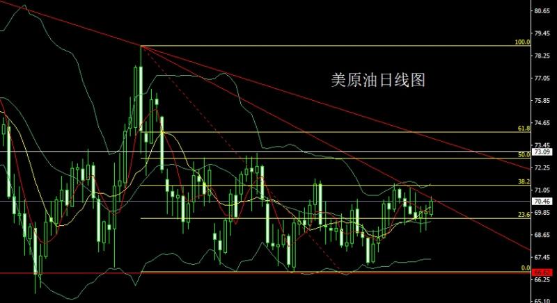 美原油市场前日小幅低开在69.76的位置后行情小幅回踩69.63的位置后行情强势拉升,日线最高触及到了70.70的位置后行情整理,日线最终收线在了70.46的位置后行情以一根上影线稍长于下影线的中阳线收线,而这样的形态收尾后,周一69.2的多止损跟进在69.5,今日70多止损69.5,目标看70.8和71.5和72.
