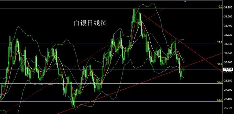 白银市场前日开盘在29.676的位置后行情先拉升给出29.78的位置后行情回落,日线最低给到了29.463的位置后行情尾盘拉升,日线最终收线在了29.654的位置后行情以一根下影线长于上影线的长脚十字星形态收线,而这样的形态收尾后,今日先拉升给出30.2空止损30.6,下方目标看29.7和29.45和29.2.