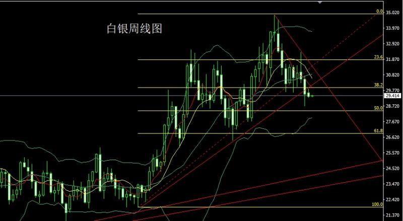 白银市场上周小幅高开在29.604的位置后行情先拉升给出29.89的位置后行情尾盘回落,周线最低给到了29.289的位置后行情整理,周线最终收线在了29.362的位置后行情以一根上影线稍长的孕线倒锤头形态收线,而这样的形态收尾后,今日29.7空止损29.9,目标看29.3和29关口争夺