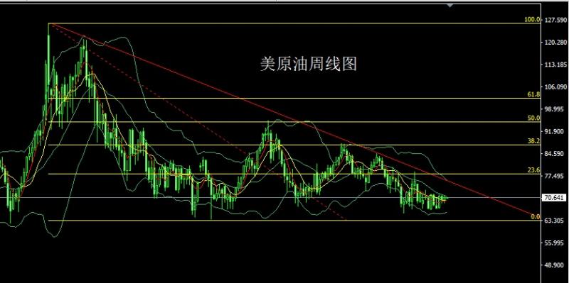 美原油市场上周区间震荡,周初行情开盘在69.76的位置后行情先回落,周线最终收线在了68.85的位置后行情强势拉升,周线最高触及到了71的位置后行情整理,周线最终收线在了70.49的位置后行情以一根下影线稍长于上影线的纺锤形态收线而这样的形态收尾后,早盘先回落给出69.9多止损69.4,目标看70.7和71和71.5压力,如果破位的话上方空间打开,行情将冲击75压力。