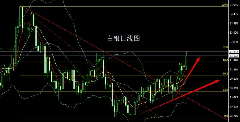 白银市场昨日开盘在31554的位置后行情先回落,日线最低给到了31.338的位置后行情震荡拉升,日线最高触及大了32.366的位置后行情整理,日线最终收线在了32.122的位置后行情以一根上影线稍长于下影线的大阳线收线,而这样的形态收尾后,今日的行情31.75多止损31.55,目标看32.15和32.35,破位看32.6和32.8.