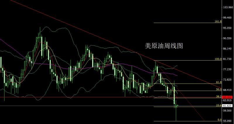 美原油市场上周低开在60.71的位置后行情先拉升,周线最高触及到了63.99的位置后行情强势回落,周线最低给到了55.1的位置后行情拉升,周线最终收线在了61.48的位置后行情以一根下影线极长的启明星形态收线,而这样的形态收尾后,本周58多止损57.5,目标看61和62-63.