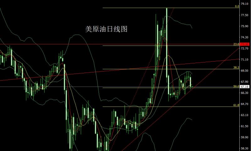 美原油市场昨日开盘在68.53的位置后行情小幅拉升给出68.97的位置后行情强势回落,日线最低给到了66.77的位置后行情整理,日线最终收线在了67.18的位置后行情以一根上下影线很长的大阴线收线,而这样的形态收尾后,今日行情有回落压力,点位上,前日69.1的空减仓后止损跟进在68.5,今日68空止损68.5,下方目标看67和66.7,跌破看66.2和66.