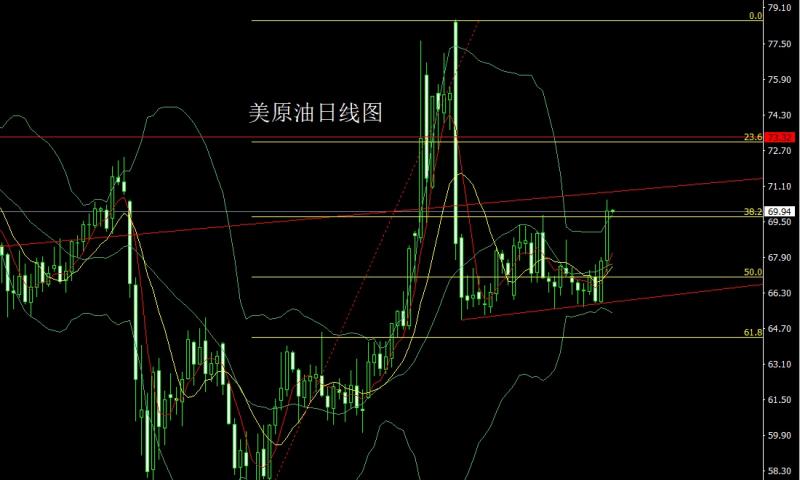 美原油市场昨日开盘在67.76的位置后行情先回落,日线最低给到了67.23的位置后行情强势拉升,日线最高触及到了70.49的位置后行情整理,日线最终收线在了69.97的位置后行情以一根下影线稍长于上影线的大阳线收线,而这样的形态收尾后,今日延续低多,点位上,今日68.8多止损68.2,目标看69.6和70.2和70.5,破位看70.8和71.