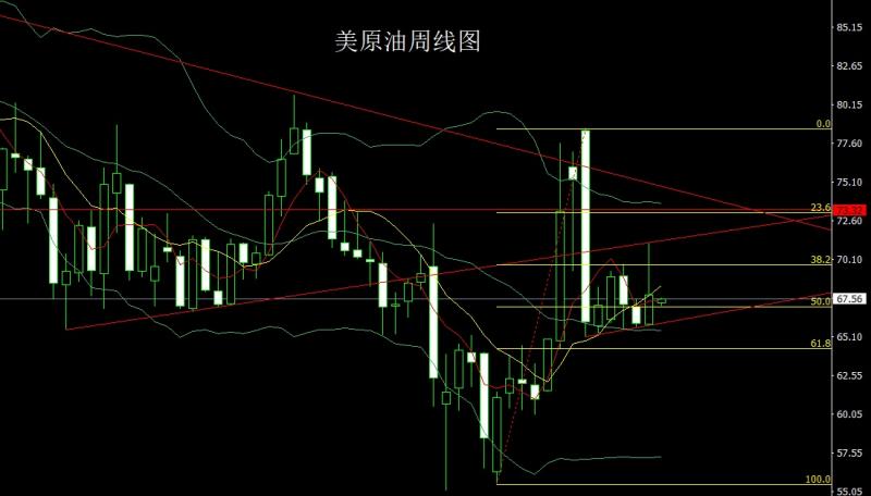 美原油市场上周开盘在65.88的位置后行情小幅回踩给出65.83的位置后市场强势拉升,周线最高触及到了前期趋势线压力71.2的位置后市场强势回落,周线最终收线在了67.8的位置后行情以一根上影线极长的类倒锤头形态收线,而这样的形态收尾后,今日68.6空止损69.1,下方目标看67和66.5和66.