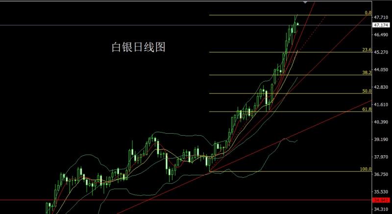 白银市场昨日开盘在46.639的位置后行情小幅回踩给出46.597的位置后行情强势震荡拉升,日线最高触及到了47.826的位置后行情整理,日线最终收线在了47.309的位置后日线以一根上影线很长的中阳线收线,而这样的心态收尾后,下方37.8的多和38.8的多减仓后止损跟进在42持有。上周五44.6的多减仓后止损跟进在44.8持有,今日47.6空止损47.85,目标看47和46.6和46.3-461.