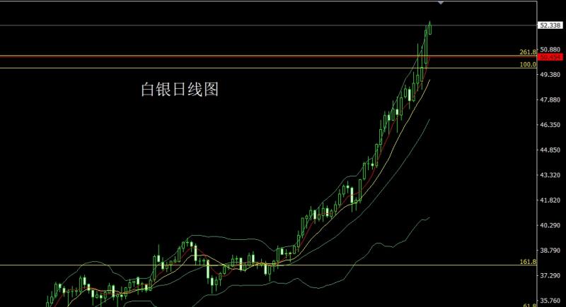 白银市场昨日高开在50.054的位置后行情回补缺口给出49.7的位置后行情强势拉升,日线最高触及到了52.295的位置后行情整理,日线最终收线在了52.026的位置后行情以一根上下影线等长的大阳线收线,而这样的形态收尾后,今日的行情有继续看多需求,点位上,下方37.8的多和38.8的多和44.6的多减仓后止损跟进在47持有,今日51.2多止损50.9,目标看52和52.3,破位看52.6和53.
