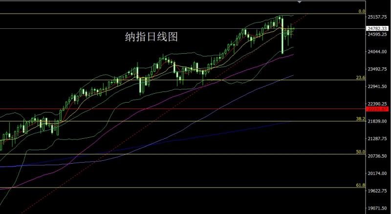 纳指市场昨日开盘在24584.23的位置后行情先拉升,日线最高触及到了24940.38的位置后行情急速回落,日线最低给到了24482.7的位置后行情尾盘强势拉升,日线最终收线在了24770.11的位置后,日线以一根上影线长于下影线的中阳线收线,而这样的形态收尾后今日24600多止损24540,目标看24700和24800和24950.