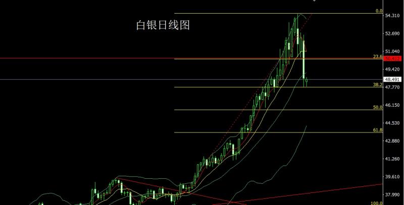 白银市场昨日低开在52.022的位置后行情回补拉升给出52.57的位置后行情强势回落,跌破50.4的小时级别头肩顶形态颈线后行情加速下行,日线最低给到了本轮上行斐波那契的38.2支撑47.8的位置后行情整理,日线最终收线在了48.553的位置后日线以一根下影线稍长于上影线的大阴线收线,而这样的形态收尾后,今日回踩后有回落压力,点位上,下方37.8的多和38.8的多跟进在42持有44.6的多早盘离场。今日50空保守50.2空损50.45下方目标看48和47.8,跌破看47和46.5.