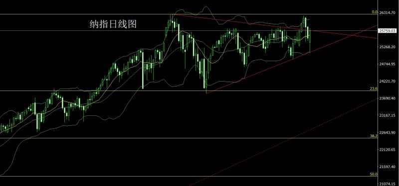 纳指市场昨日低开在25405.85的位置后行情回补缺口给出25532.97的位置后行情强势回落,日线最低给到了25066.87的位置后行情受到技术支撑强势拉升,日线最高触及到了25835的位置后整理,日线最终收线在了25759.03的位置后,日线以一根下影线极长的大阳线收线,而这样的形态收尾后,今日的行情25450多止损25390,目标看25550和25650和25750-25835.破位的话看25900和26000.