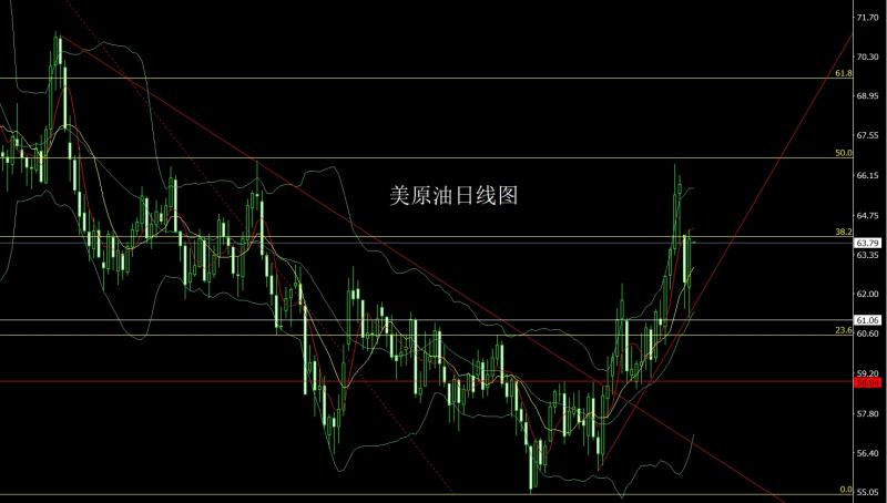 美原油市场昨日低开在62.22的位置后行情先回落,日线最低给到了61.13的位置后行情受到本轮上行趋势线和日线级别10日均线支撑强势拉升,日线最高触及到了64.26的位置后整理,日线最终收线在了63.92的位置后,日线以一根下影线长于上影线的大阳线收线,而这样的形态收尾后,今日的行情回踩多,点位上,今日62.7多止损62.2,目标看64和64.6和65-65.3.