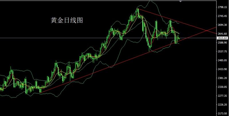前日行情早盘开盘在2605.4的位置后行情先回落给出2602.5的位置后行情拉升,盘中给出2618附近后行情承压回落,给出2605附近后尾盘时段二次拉升,日线最高触及到了2627.7的位置后行情整理,日线最终收线在了2624.4的位置后行情以一根略带影线的中阳线收线,而这样的形态收尾后,日线在三角区间下轨附近有支撑信号,今日的