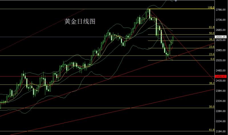 昨日黄金市场延续拉升过程,早盘开盘在2632.2的位置后行情先拉升给出2642的位置后行情快速回落,日线最低给到了2618.5的位置后行情强势拉升,日线最高触及到了2655.3的位置后行情受到本轮下降压力线压力整理,日线最终收线在了2650.2的位置后日线以一根下影线很长的大阳线收线,而这样的形态收尾后今日的行情延续看多,
