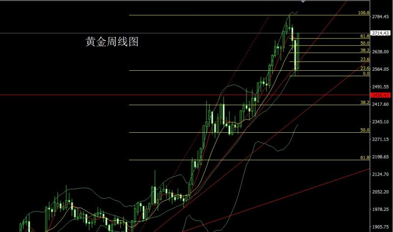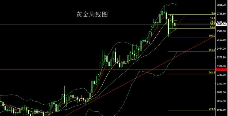 上周黄金市场强势回落,周初行情开盘在2684.7的位置后行情小幅拉升给出2687.1的位置后行情强势回落,盘中受到基本面利空因素的打压和技术获利了结的共振作用跌破多重支撑,周线最低给到了2535.7的位置后行情超跌整理,周线最终收线在了2561.5的位置后行情以一根下影线很长的大阴线收线,而这样的形态收尾后,本周市场依