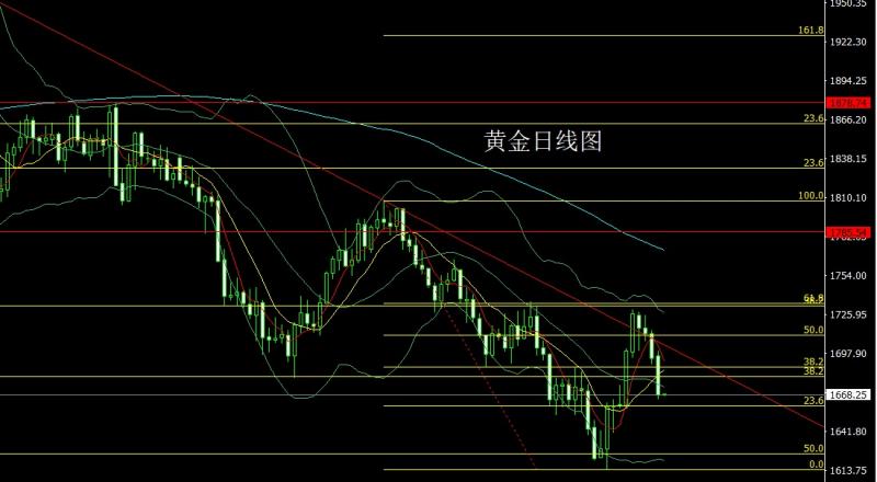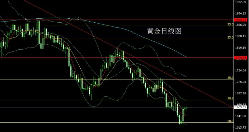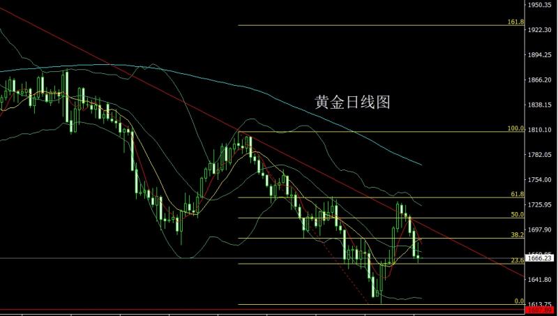 昨日黄金市场早盘开盘在1668.4的位置后行情先;拉升给出1673.5的位置后行情回落,日线最低给到了1660.5的位置后行情震荡拉升,美盘最高触及到了1684的位置后行情尾盘回落,日线最终收线在了1665.9的位置后行情以一根上影线极长的倒锤头形态收线,而这样的形态收尾后,下方1622-1623和1642的多止损跟进在1655持有。今日的