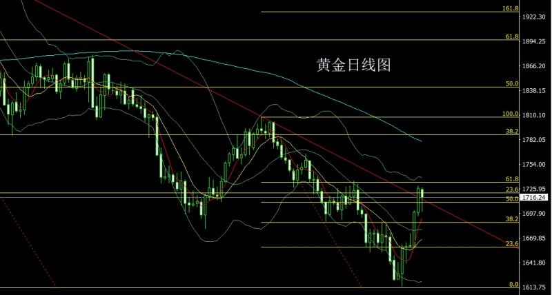 昨日黄金市场出现获利了结过程,早盘开盘在1725.4的位置后行情小幅拉升给出1728的位置后行情回落,日线最低给到了1700.3的位置后尾盘拉升,日线最终收线在了1716.2的位置后行情以一根下影线很长的高位锤头形态收线,而这样的形态收尾后,今日的行情进入盘整期,点位上,上周1622-1623和1642的多止损跟进在1660持有,今日