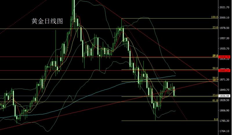 昨日黄金市场早盘高开在1874.9的位置后行情先拉升给出1879.2的位置后行情一路回落,日线最低给到了1818.8的位置后行情小幅整理,日线最终收线在了1818.9的位置后行情以一根上影线稍长的饱和大阴线收线,而这样的大阴线收尾后,日线大阴包阳,今日的行情回踩做空,点位上,今日1836空保守1838空,止损1842,目标看1806和1