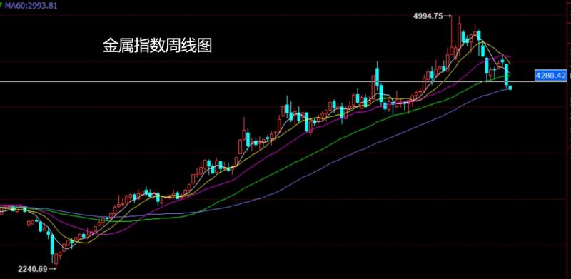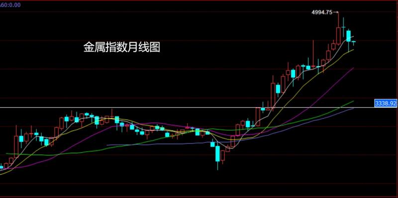 上周金属指数市场完成月线构造,回顾一下5月的月线,月初金属指数低开在4671.69的位置后行情回补缺口给出4706.84的位置后行情展开回落,月线最低给到了4296.77的位置后行情受到基本面和技术支撑整理,月线最终收线在了4412.41的位置后行情以一根下影线很长的大阴线收线,而这样的形态收尾后,6月的行情在月初的反弹后行
