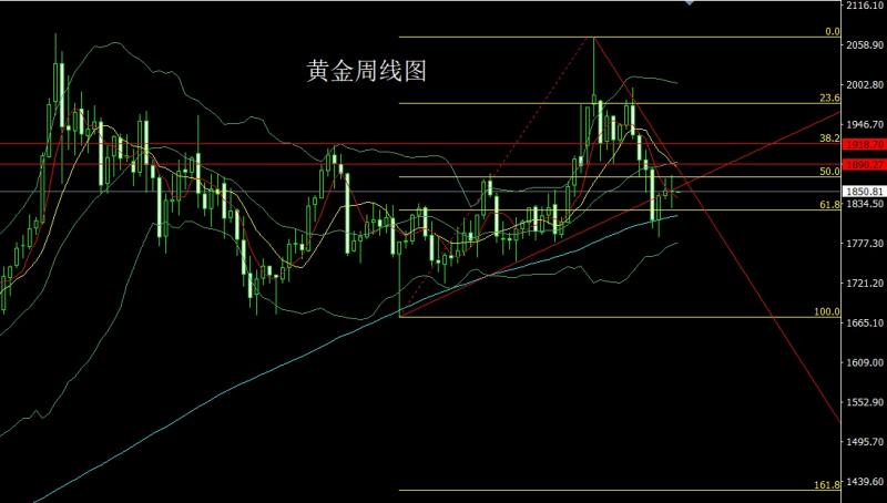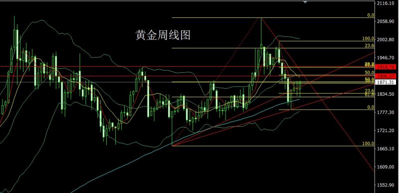 上周黄金市场早盘开盘在1852的位置后行情先拉升给出1864.5的位置后行情快速回落,周线最低给到了1828.3的位置后行情拉升,周线最高触及到了1874.1的位置后行情受到技术压力和非农影响,展开回落过程,周线最终收线在了1850.9的位置后周线以一根长脚十字星形态收线,而这样的形态收尾后,本周先延续周五非农的回落压力逢