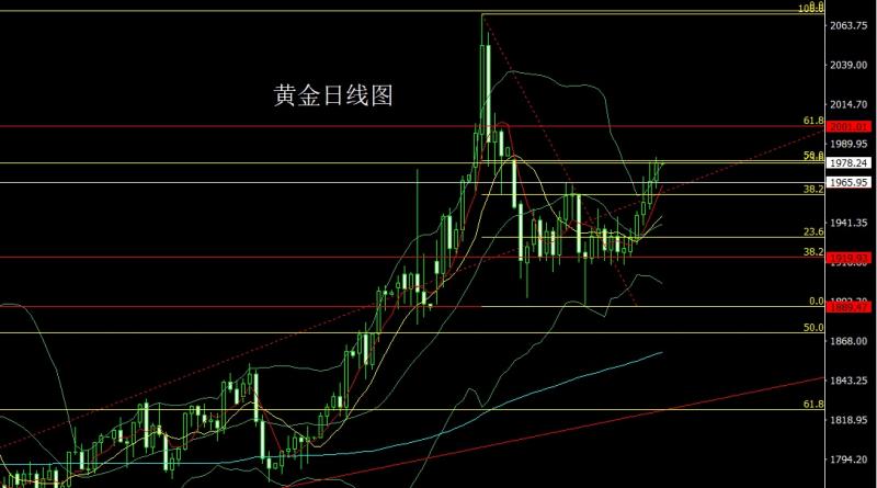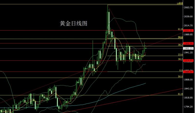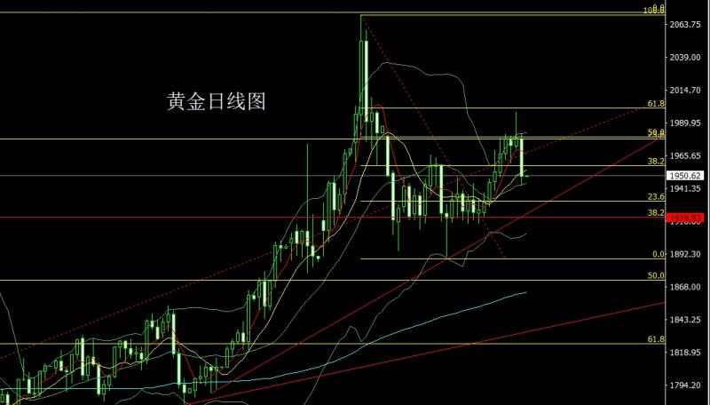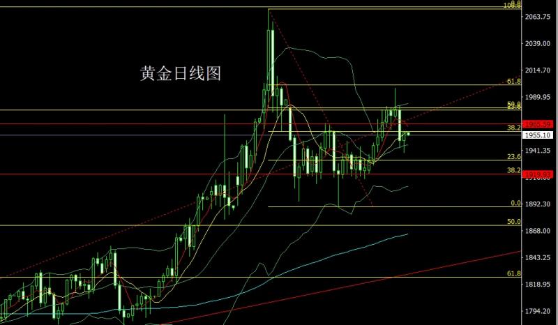 今日上午9:00-11:00我在中金路演,希望平时关注并支持我的投资者能积极参与,路演地址:htt://roadhow.cnfol.co/how/31289 昨日黄金开盘在1953.1的位置后行情回踩1949.5的位置后行情区间整理美盘行情受到美国CI爆表影响强势拉升,破位1967压力后行情最高触及到了本轮回落斐波那契的最后压力关口61.8的压力1978.7的