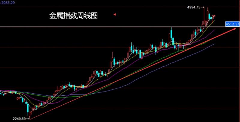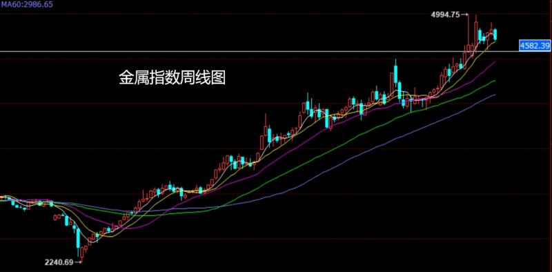 上周金属指数市场周初开盘在4704.85的位置后行情先延续回落,周线最低给到了4597.74的位置后行情受到央行再次降准预期的影响行情展开拉升过程,周线最高触及到了4800.68的位置后行情整理,日线最终收线在了4788.25的位置后,周线以一根下影线很长的锤头形态收线而这样的形态收尾后,下周的市场在技术上有反弹需求,但大
