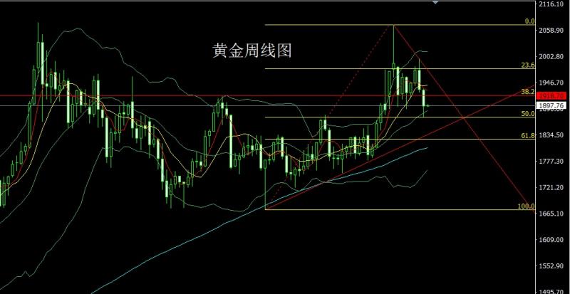 上周黄金市场延续了前一周阴包阳形态的回落压力,周初行情开盘在1931的位置后行情小幅拉升给出1934.7的位置后行情快速回落,周线最低给到了1971.6的位置后行情得到本轮周期上行斐波那契50支撑强势整理,周线最终收线在了1896.3的位置后行情以一根下影线很长的大阴线收线,而这样的形态收尾后,本周行情延续空,点位上,