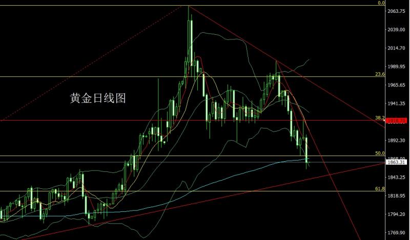 昨日黄金市场延续了上周五的回落压力回落,早盘行情开盘在1895.7的位置后行情回踩1900的位置后行情直接回落,日线最低给到了1854.3的位置后行情整理,日线最终收线在了1862.7的位置后行情以一根下影线长于上影线的大阴线收线,而这样的形态收尾后日线有效破位本轮上行斐波那契的50关口支撑,今日的行情回踩延续空,点位