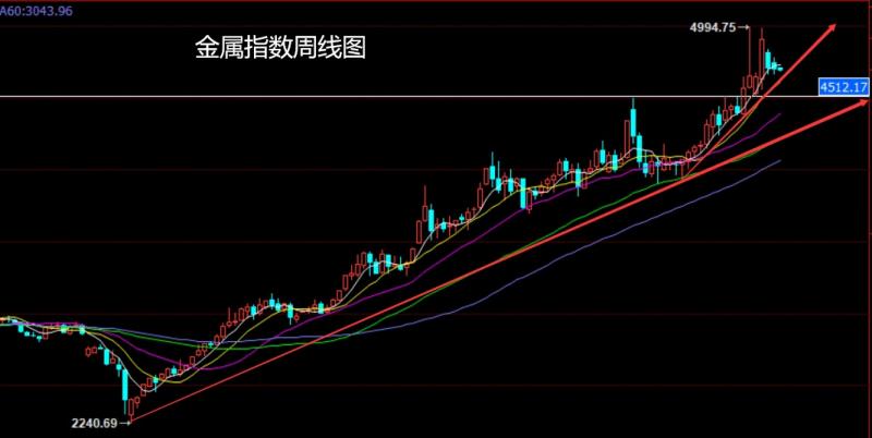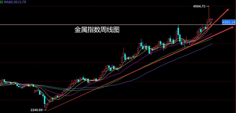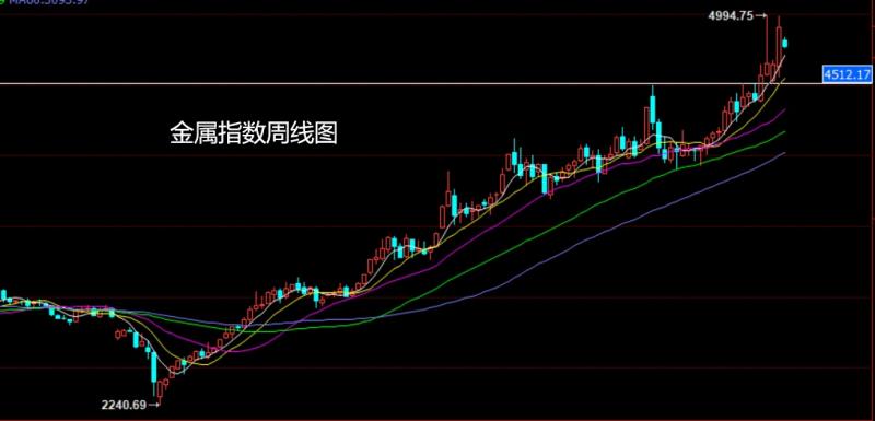 上周金属指数市场受到避险刺激行情二次冲高,周初开盘在4632.31的位置后行情先回落给出4566.67的位置后行情受到外围金属市场强势拉升影响行情冲高,周线最高触及到了4984的位置后行情冲高回落,周线最终收线在了4770.39的位置后,周线以一根上影线长于下影线的纺锤周线收线而这样的形态收尾后,本周的行情周初依旧有看空
