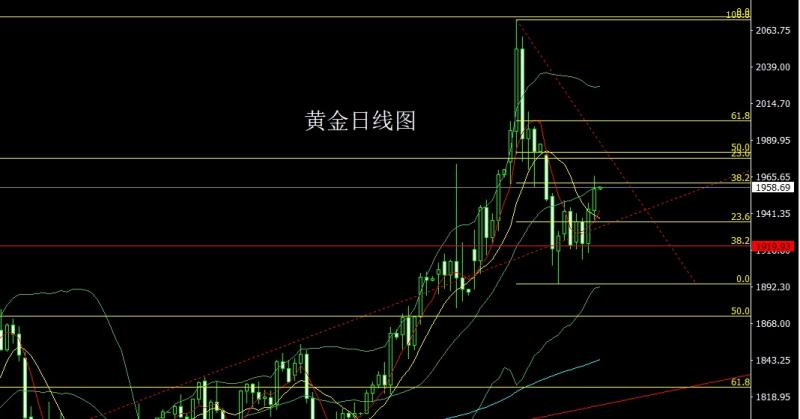 昨日黄金市场延续了前日触底反弹的锤头拉升形态过程,早盘开盘在1927.5的位置后行情先回落给出1922.9的位置后行情一路上行,日线最高触及到了日线布林中轨压力1950的位置后行情冲高整理,日线最终收线在了1942.3的位置后行情以一根上影线稍长于下影线的大阳线收线,而这样的形态收尾后,今日的行情回踩后还有看多需求,