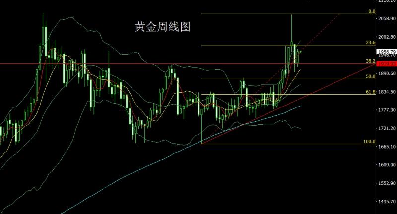 上周黄金市场周初开盘在1922的位置后行情先回落给出1909.6的位置后行情拉升,周线最高触及到了1966.5的位置后行情冲高整理,周线最终收线在了1957.7的位置后行情以一根下影线稍长于上影线的大阳线收线,而这样的形态收尾后,本周的行情区间先低多,点位上,上方2020的空和2006.6的空止损跟进在1980持有,今日的行情如果