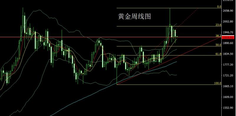上周黄金市场早盘开盘在1924.2的位置后行情先回落给出1914.6的位置后行情震荡拉升,给出1944.7的位置后行情在此区间内宽幅震荡,到周五周线最触及到了1948.2的位置后行情整理,周线最终收线在了1945.9的位置后行情以一根下影线很长的中阳线收线,而这样的形态收尾后,本周的行情周初有看多需求,点位上,上方2020的空和2