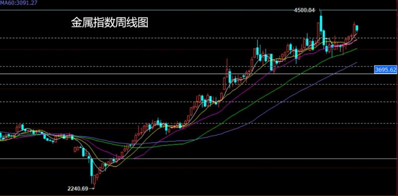 上周金属指数市场周初开盘在4148.94的位置后行情先回落给出4115.46的位置后行情强势拉升,周线最高触及到了4200.06的位置后行情冲高整理,周线最终收线在了4169.77的位置后行情以一根下影线稍长于上影线的十字星形态收线,而这样的形态收尾后,下周金属指数市场虽然有支撑,但上方压力也在增强,所以短多后空是下周金属