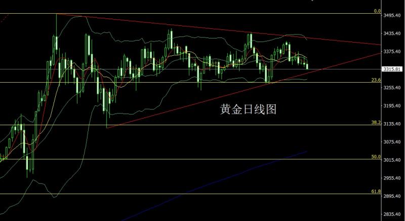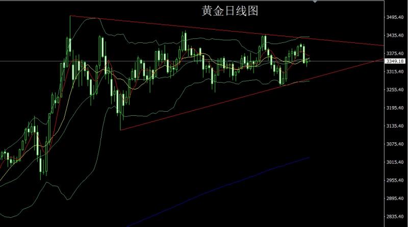 昨日黄金市场早盘开盘在3398.5的位置后行情先拉升给出3405.3的日线高点后行情强势震荡回落,美盘最低给到了3341.2的位置后行情低位整理,日线最终收线在了3342.7的位置后行情以一根上影线稍长的大阴收线,而这样的形态收尾后,日线有效下破布林中轨支撑,本轮行情有想三角区间下轨支撑方向运行,点位上,今日先拉升给出3