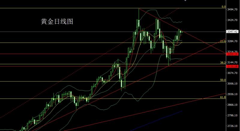 昨日黄金市场强势拉升,早盘开盘在3242.7的位置后行情先回落,日线最低给到了3237.1的位置后行情震荡拉升,给出3272的位置后行情回落给出3252的位置后行情强势拉升,日线最高触及到了3337.8的位置后行情整理,日线最终收线在了3333.9的位置后行情以一根下影线稍长于上影线的大阳线收线,而这样的形态收尾后,今日的行情