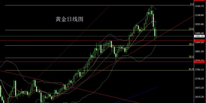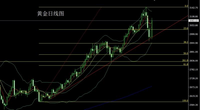 昨日黄金市场早盘低开在3027.6的位置后行情先回落给出2969.9的位置后行情强势拉升,日线最高触及到了3056.3的位置后行情承压震荡回落,美盘时段行情加速下行,日渐最低给到了2955.6的位置后行情受到前期历史高点和本轮上行趋势线支撑拉升,日线最终收线在了2983的位置后行情以一根上影线稍长于下影线的大阴线收线,而这