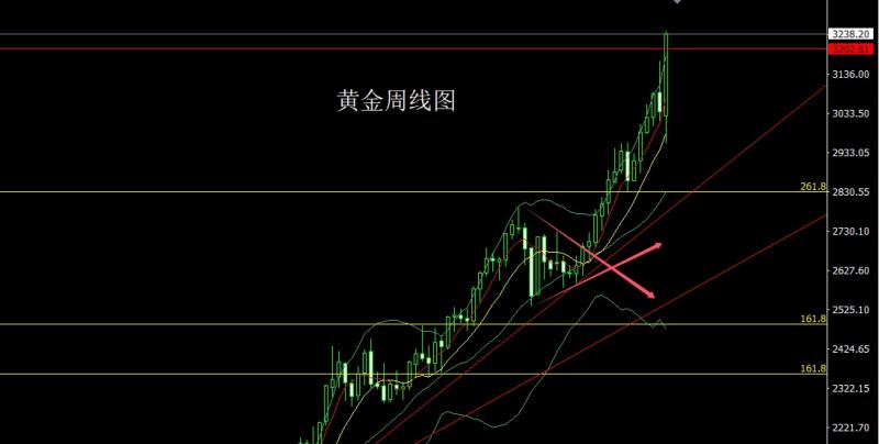上周黄金市场周初奥夫低开在3027.3的位置后行情回补缺口给出3056.8的位置后行情延续前一周的回落压力下行,周线最低给到了2954.5的位置后行情受到中线级别十日均线和基本面避险情绪支撑强势拉升,破位前一周倒锤头高点3168.1的位置后行情强势快速拉升,周线最高触及到了3245.6的位置后行情整理,周线最终收线在了3238.2