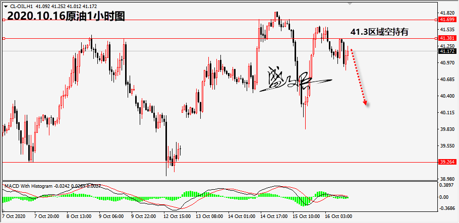 原油正如笔者的预期,欧盘笔者明确给出在41.4区域参与空头,欧盘价格反抽41.38位置后下跌,刚好触及笔者提示参与空头区域,已经在41.3区域附近参与空头者继续持有。