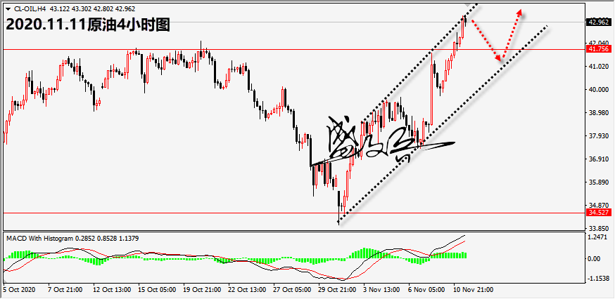 原油继续延续强势向上,价格目前处于43美元附近。在新冠疫苗提振航空业恢复,以及美国大选落定,市场之前的担忧消退支持原油上涨。笔者之前明确给出逢低参与多头的思路,只要根据笔者思路参与多头者全部大涨。
